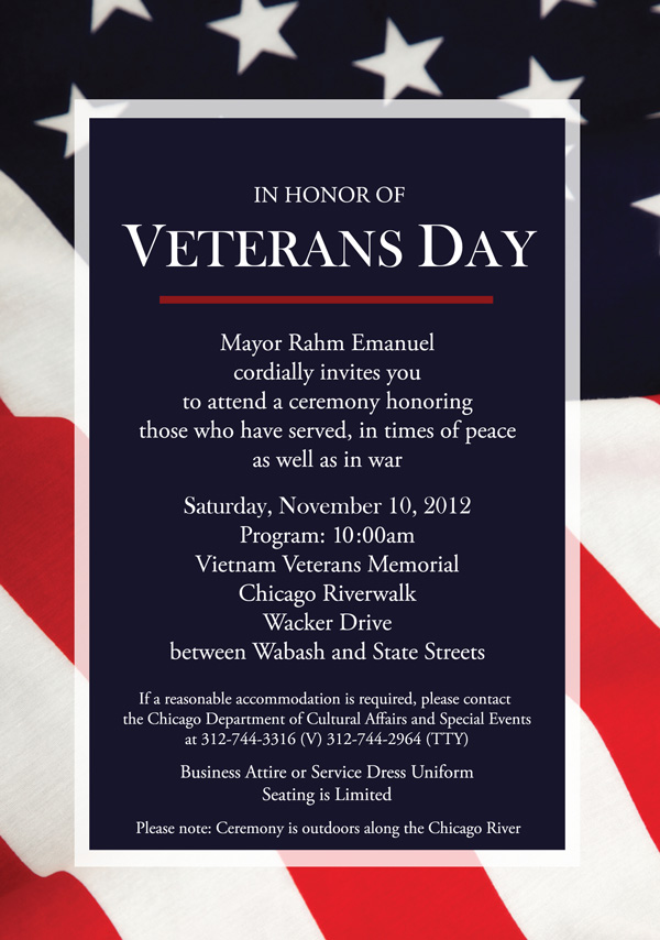 City of Chicago Veteran’s Day Celebration Posted on November 7, 2012 by nwvuwebmaster Saturday, Nov 10, 2012 Join us at 10:00 a.m. – 12;00 p.m. at the City of Chicago Veteran’s Day Celebration Wacker Dr & State Streen at the Vietnam Memorial River Walk