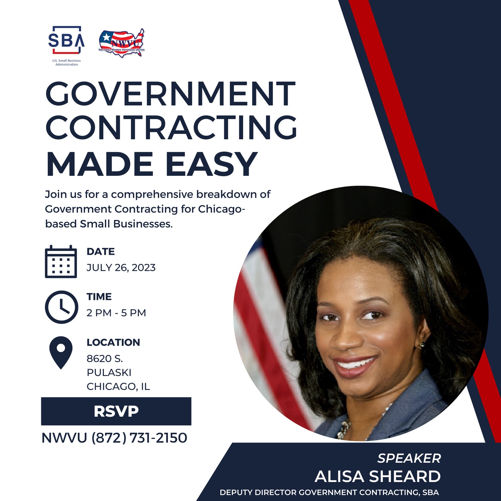 Join us for a comprehensive breakdown of Government Contracting for Chicago based small businesses with speaker Alisa Sheard, Deputy Director Government Contracting, SBA.