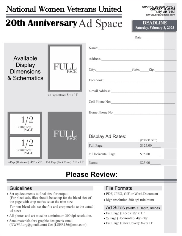 Generous sponsors are being sought in preparation of National Women Veterans United 20th Anniversary Celebration and Fundraising Event being held on March 22, 2025.