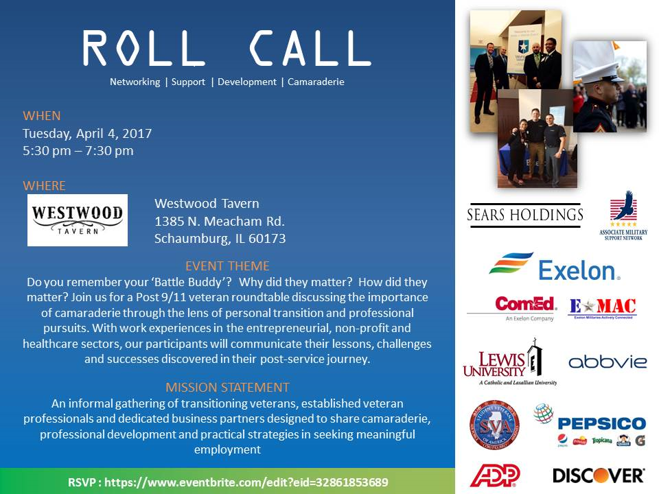 Do you remember your ‘Battle Buddy’? Why did they matter? How did they matter? Join Roll Call Chicagoland for a Post 9/11 veteran roundtable discussing the importance of camaraderie through the lens of personal transition and professional pursuits. With work experiences in the entrepreneurial, non-profit and healthcare sectors, our participants will communicate their lessons, challenges and successes discovered in their post-service journey.