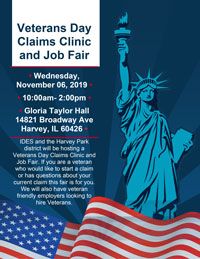IDES and the Harvey Park district will be hosting a Veterans Day Claims Clinic and Job Fair. If you are a veteran who would like to start a claim or has questions about your current claim this fair is for you. We will also have veteran friendly employers looking to hire Veterans.