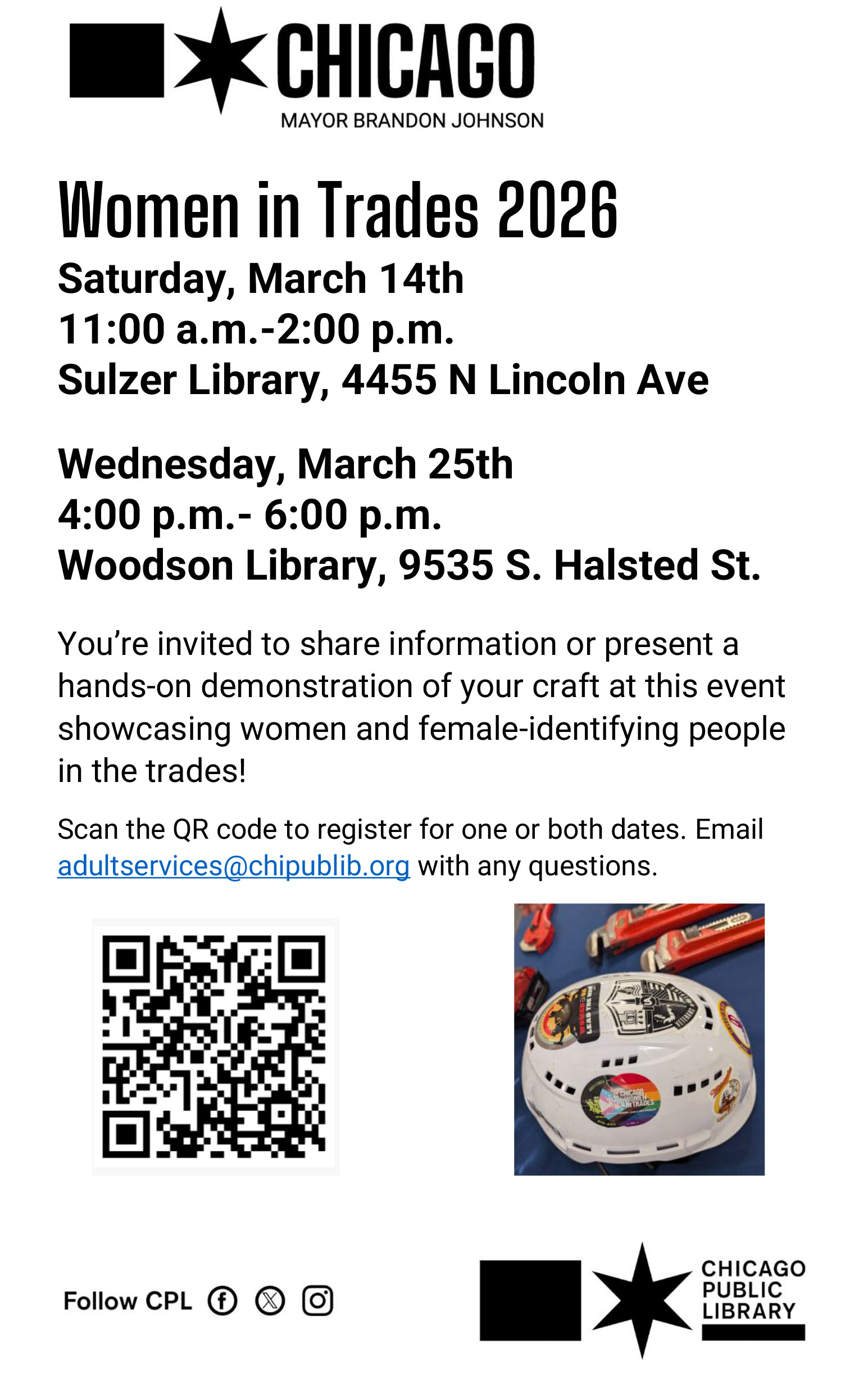 Sulzer Regional will host Women in Trades on Saturday, March 14th from 11am-2pm. Woodson Regional‘s event will be held on March 25th from 4-6pm.
