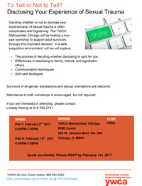 Deciding whether or not to disclose your experience(s) of sexual trauma is often complicated and frightening. The YWCA Metropolitan Chicago will be hosting a two-part workshop to support adult survivors through this important decision. In a safe, supportive environment, will we will explore: