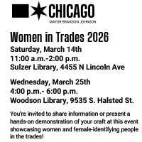 Sulzer Regional Library 4455 N Lincoln Ave, Chicago, IL, Chicago, IL, United StatesSulzer Regional will host Women in Trades on Saturday, March 14th from 11am-2pm. Woodson Regional's event will be held on March 25th from 4-6pm.