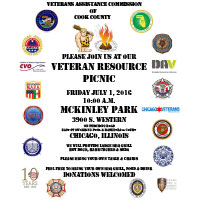 VETERANS ASSISTANCE COMMISSION Of Cook county Veteran Resource Picnic on, Friday, JULY 1, 2016 at 10:00 A.M. at McKinley Park, 3900 S. Western on pershing road. We will provide LARGE BBQ grill Hot dogs, Hamburgers & soda. Donations Welcomed.