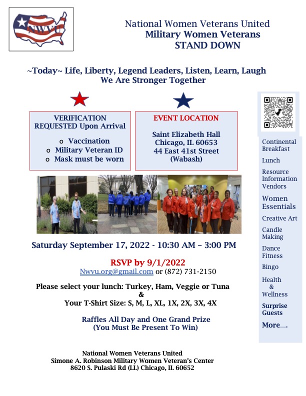 Save the date, September 17, 2022 for the National Women Veterans United Military Women Veterans Stand Down. Enjoy a continental breakfast, Lunch and with Resource information Vendors, Women Essentials, Creative Art and Surprise Guests. Activities to include Candle Making, Bingo, and more…..