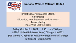 Join the National Women Veterans United for Breast Cancer Awareness Month on Friday, October 21, 5:30PM – 7PM at the SGT Simone A. Robinson Military Women Veteran’s Center. We will be celebrating education, new treatment and survivors and also, remembering those who lost the battle. There will be refreshments and raffles Continue reading