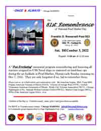 Invite to the 81st Anniversary PEARL HARBOR Day of Remembrance 2022. The Once & Always Chicago Marines presents the 81st Remembrance of the attack on Pearl Harbor memorial program. Saturday, December 3, 2021 at 11 am at the American Legion located at 1824 W. Cortland St., Chicago IL 60622. Continue reading