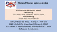 Breast Cancer AwarenessSaturday, October 12th | 2:30 - 3:00 pm8620 S Pulaski Rd. - Lower Level - Chicago, IllinoisHost: National Women Veterans United
