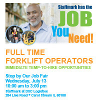 Job fair on Wednesday, July 13 in Carol Stream IL. 10-15 temp to hire, full-time forklift opportunities. Read more [...]
