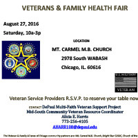 VETERANS & FAMILY HEALTH FAIR on August 27, 2016, Saturday, 10am-3pm at MT. CARMEL M.B. CHURCH.