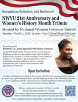 An open invitation is extended to all veterans and their non‑veteran guests to join us for good food, spirited camaraderie, and the inspiring words of Ms. Shoshana Johnson, as we commemorate the 21st Anniversary of National Women Veterans United and celebrate Women’s History Month.