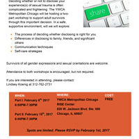 Deciding whether or not to disclose your experience(s) of sexual trauma is often complicated and frightening. The YWCA etropolitan Chicago will be hosting a two-part workshop to support adult survivors through this important decision.