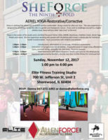 A wonderful afternoon planned Nov 12 for SheForce! Our restorative aerial yoga activity, followed up by walking next door to enjoy appetizers sponsored by Skooters Saloon in Shorewood IL. Read more [...] SheForce restorative aerial yoga