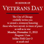 City of Chicago cordially invites you to attend a ceremony honoring those who have served, in times of peace as well as in war. Monday, November 11, 2013 - Program: 11am - Soldier Field Gate O at south end. RSVP by November 6, 2013 to (312) 744.0626