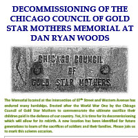 Decommissioning of the Chicago Council of Gold Star Mothers Memorial. Please join us to mark this solemn occasion. Decommissioning Ceremony Color Guard * Speakers * Taps honoring our fallen heroes . Continue reading