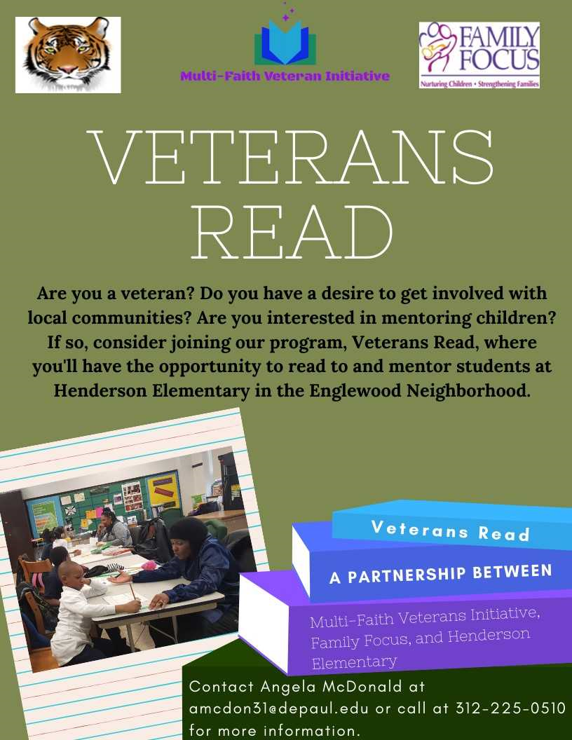 Multi-Faith Veteran Initiative is currently recruiting veterans to mentor 2 – 4th graders at Charles A. Henderson School on Monday’s from 3:00 – 5:00 pm. For program information contact MVI Community Veteran Coordinator, Angela McDonald, email amcdon31@depaul.edu or call 312-225-0510.
