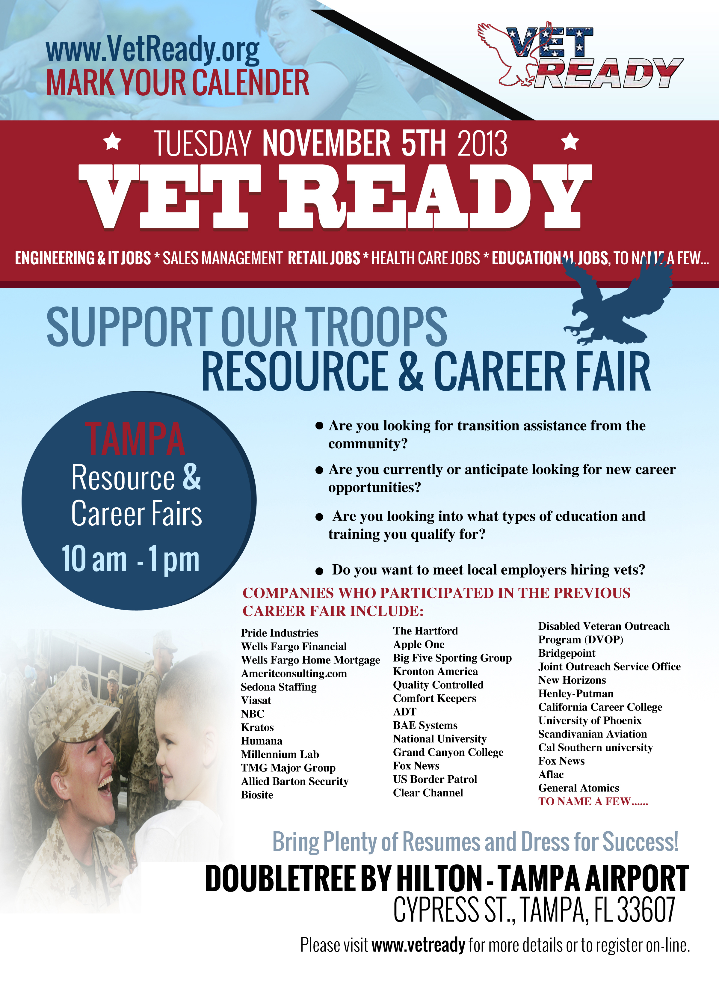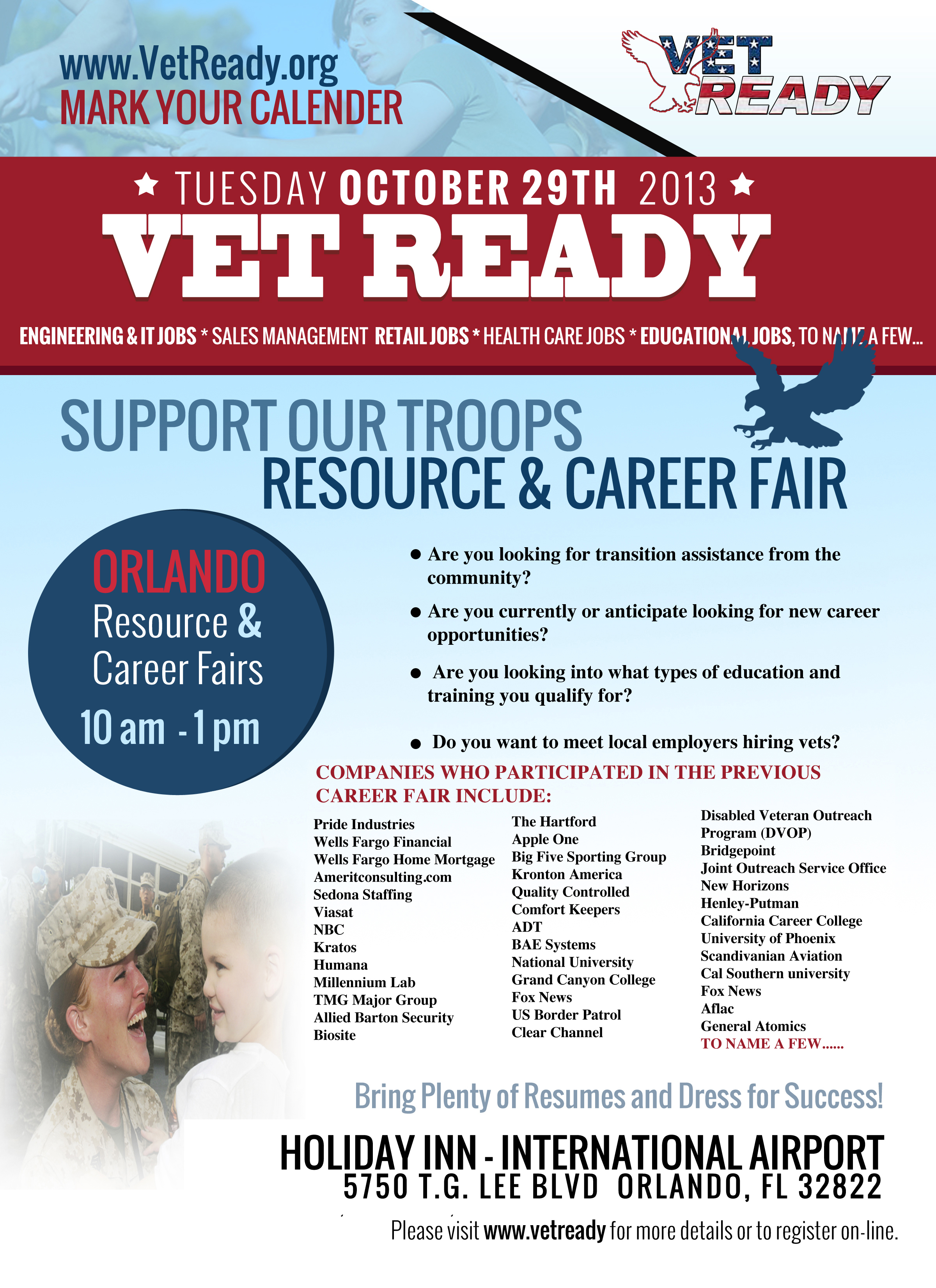 VetReady Resource and Career Fairs are designed for personnel leaving the service, as well as the ones who have already transitioned but are seeking a career change, VetReady also cater directly to their spouses and families. Career Fair events help veterans make the transition into the civilian workforce by matching their skills and career goals with opportunities from various companies and colleges. VET READY, is holding a  Resource and Career Fair in Orlando on October 29, 2013 and in Tampa on November 5, 2013  and are trying to disseminate the information to all members and their spouses/families in the Central Florida area.
